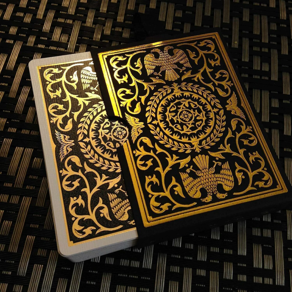 O detalhamento em dourado em cada carta confere um visual majestoso, graças a uma tecnologia exclusiva de hot stamping desenvolvida pela Cartamundi. Esse brilho luxuoso não compromete o toque: o acabamento B9 Finish garante fluidez e durabilidade, ideal tanto para mágica quanto para cardistry.